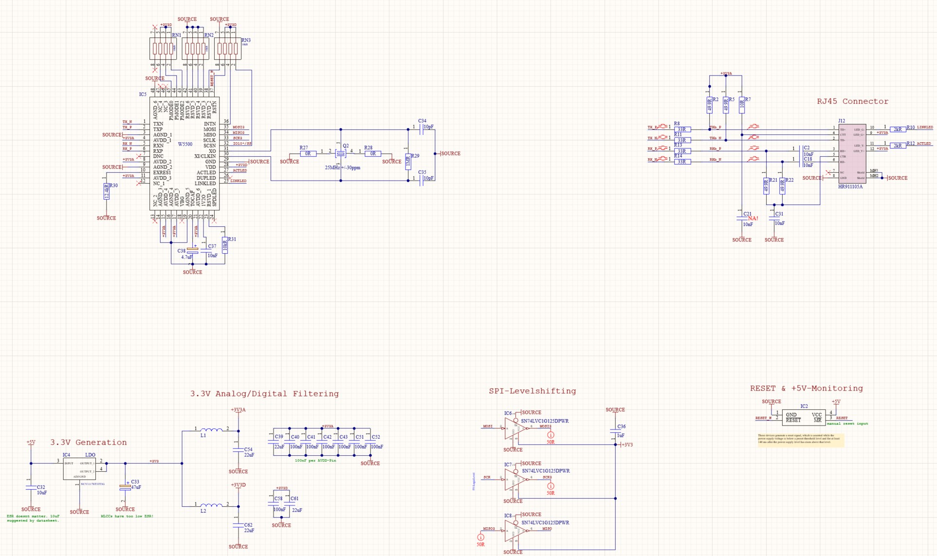 Mir fällt auf Anhieb nichts auf. Sind die Beschriftungen auf dem PCB gut lesbar? Eins meiner W5500-Boards funktionierte nicht, weil ich beim Bestücken an einer Stelle fälschlich C mit R vertauscht hatte :( LG, Sebastian PS: Mein Board hatte deine 33R nicht. Wo kommen die her?