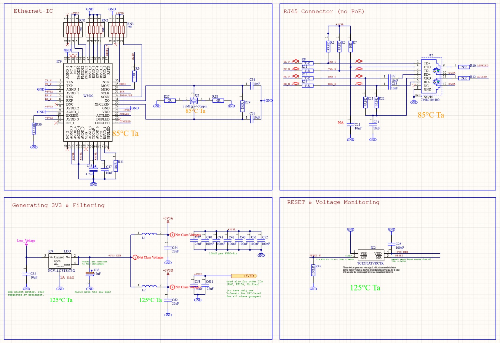 Hallo zusammen, nachdem ich mir die letzten Tage die Zähne dran ausgebissen habe, wende ich mich nun an die Community. Kurzer Abriss: Ich habe bereits ein PCB designed und gefertigt, wo ich auch den W5500 drauf habe inkl. Schaltung. Ethernet funktioniert dort. Nun habe ich ein neues Board gebaut und mich an dem alten Design orientiert - nur dieses mal will Ethernet einfach nicht! Was funzt nicht: Link LED leuchtet nicht, ich kann keine NLP-Pulse an TXP/TXN messen! Unterschiede zwischen altem und neuen Design: 1.) andere Ethernetbuchse:(weil die Alte nicht mehr verfügbar) alt: http://www.kosmodrom.com.ua/pdf/HR911105A.pdf neu: https://www.we-online.com/components/products/datasheet/74980104400.pdf 2.) Routing angepasst, bedingt dadurch dass die neue Buchse die Pins andersrum hat (Kabel damit auch verdreht, also in Summe gleiches Pinning natürlich) 3.) Einige 10nF Caps (0402 Kerkos) sind ein anderer Typ (für z.b. die ganzen AVDD-Pins) Was hab ich gemacht bereits? - Spannungen geprüft digital und analog. Sowie die intern generierten Spannungen (1.2V/VBG) geprüft. - Oszillatorausgang - Reset ist auf high - IC gegen ein neues umgelötet, kein Erfolg (ESD oder IC Defekt schließe ich damit aus) - BTW: SPI interface schein zu funktionieren, auch der PHY Teil lässt sich konfigurieren. Nur dass eben keine NLP-Pulse gesendet werden, also irgendwas stimmt mit dem Analogteil nicht :-( Datasheet W5500: https://docs.wiznet.io/img/products/w5500/W5500_ds_v110e.pdf Hab ich irgendwas übersehen? Passen die Buchsen nicht bzw. die Übertrager da drin oder sowas?