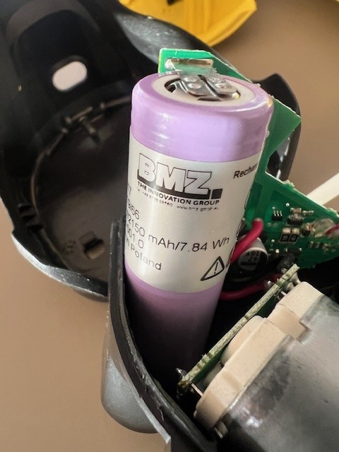Das wird doch ein ganz normaler 18650 LiIon Akku mit Lötfahnen sein, wobei die Spannungsangaben von 3.6 bis 3.7V schwanken und die Kapazität von 2000 bis 3500. Nimm einen, der entweder 3.65 oder 3.7V zulässt und nicht einen der nur 3.6V aushält, denn die LiIon Schutzschaltung auf der Platine dadrunter wird darauf ausgelegt sein. Und wenn dort keine Schutzschaltung vorhanden ist, nimm einen 18650 mit eingebautem Schutz-PCB der genügend Strom für den Motor zulässt. https://www.akkuman.de/shop/Samsung-INR18650-35E-3500mAh-37V-18650-Akku-mit-U-Loetfahne