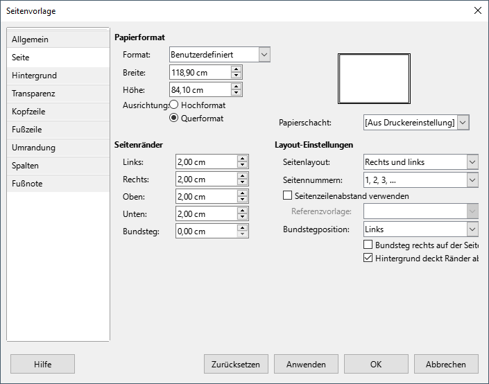 Hm, in der Tat! LibreOffice Draw kann auch A0. Wenn es wirklich LO Writer sein muss als Workaround: Format -> "Benutzerdefiniert" und dann die A0-Maße eintragen Evtl. auch mal ein "richtiges" DTP-Programm ausprobieren, wie Scribus. Das kann dann auch Beschnittränder und beherrscht die im Druckereiberich üblichen Farbräume.