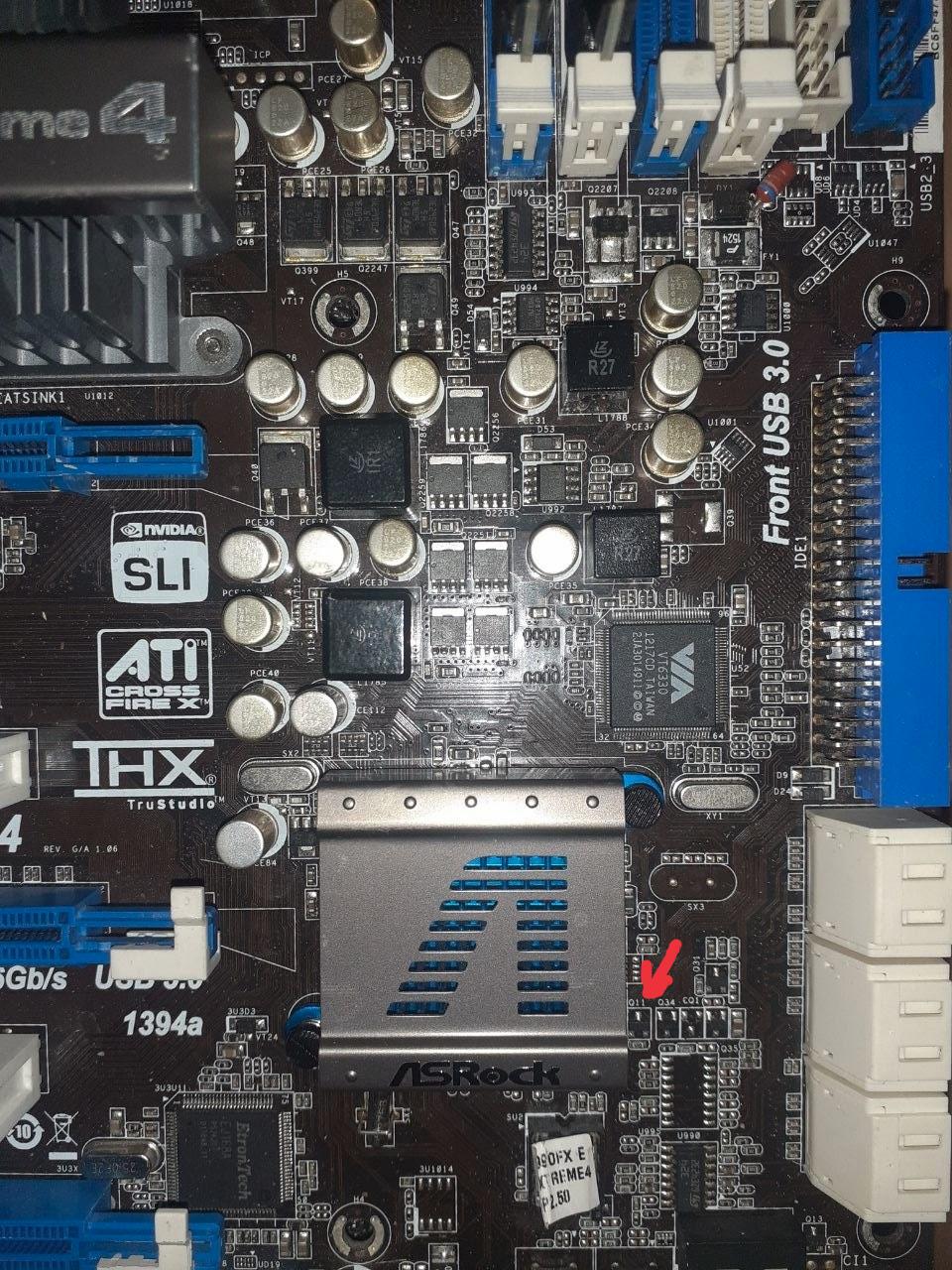 Folgendes konnte ich am Asrock 990FX Extreme4 Mainboard messen. Am Q11, ein NPN-Transistor MMBT3904, (roter Pfeil) kann ich am Kollektor (geht direkt zum "PS_ON" Pin) folgendes messen: Netzteil Standby 0,47V , Netzteil An 0,52V. An der Basis vom Q11 kann ich im Standby 0,23V und bei Netzteil AN 0,73V messen. Der Emitter von Q11 liegt an Masse. Der Kollektor von Q11 ist mit einem 1kOhm Widerstand an +5V gelegt. Die +5V sind am 1kOhm Widerstand immer vorhanden. Irgendetwas legt PS_ON auf Masse. Was könnte das sein ? (Und Nein, das ATX Netzteil ist in Ordnung, das Mainboard wurde mit 2 funktionierenden Netzteilen getestet.)