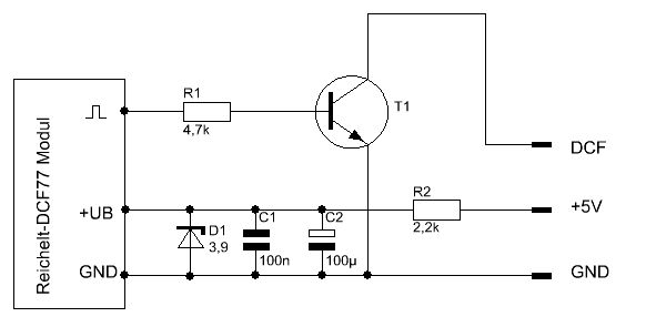 Hallo an alle! Der letzte Beitrag ist zwar schon etwas älter aber schließlich habe ich auch über die Google-Suche hier her gefunden. Vielleicht nützt es noch jemandem, das Modul gibt es immer noch bei Reichelt. Verbaut wurde das Modul für eine Nixie-Uhr nach Stefan Knellers Anleitung. Ein Stepup-Wandler und gemultiplexte Ziffernanzeigen, dazu Fernseher, Wlan-Router, Computer etc., alles in der Nähe vorhanden. Das Modul befindet sich in einem externen Gehäuse mit reichlich langem Anschlußkabel. Erstmal garnix, vollkommen tote Hose. Nachdem ich dem Signalausgang einen Transistor spendiert hatte konnte man an der Kontrollampe schon so etwas wie ein Blinken im Sekundentakt erkennen, allerdings waren da hin und wieder merkwürdige Doppelblitzer oder längere Gedenkpausen dazwischen. Dann habe ich die Betriebsspannung direkt am Modul abgeblockt, einen 100n Keramikkondensator gegen HF-Einstreuungen und einen Elko 100µ zur Glättung. Wieder nix, auch nach 12 Stunden keine Synchronisation, Mist. Dann habe ich im Forum gelesen dass ein Widerstand in der Betriebsspannungszuleitung Wunder wirken soll. Da kam mir die Idee, wenn schon der Widerstand, dann kommts auf eine Z-Diode zur Stabilisierung der stabilisierten Spannung auch nicht mehr an. Ein Blick in die Bastelkiste förderte ein 3,9V-Exemplar zu Tage - sollte passen. Und voilà - keine zwei Minuten und mein Eigenbau-Chronometer hatte die aktuelle Zeit eingefangen. Das Bild zeigt die Schaltung in der engültigen Version. Gruß, Dirk