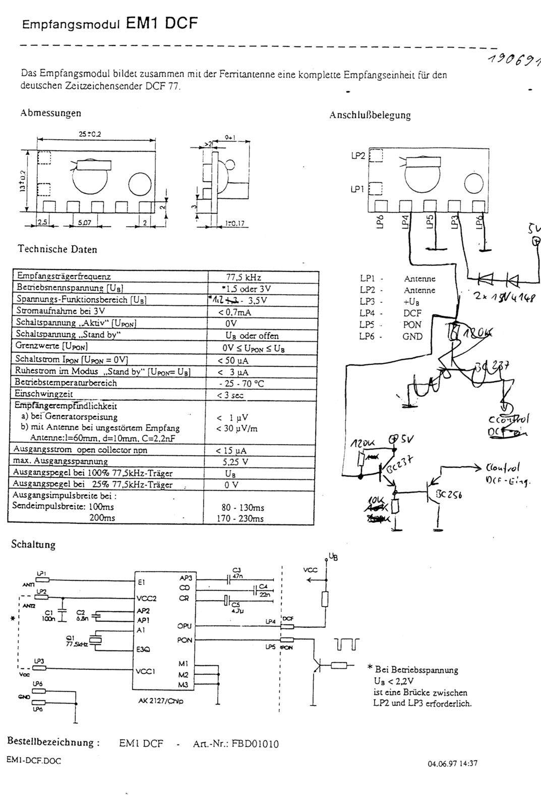 Hallo Sonic, ich habe einwenig gegoogelt und bin auf die beiden Seiten unten gestoßen. http://www.hkw-elektronik.de/pdf/radio-dd.pdf http://techwww.in.tu-clausthal.de/Dokumentation/Bauteile/Datenuebertragung/DCF77-Empfaenger/DCF_77_Signal.pdf Schließe an beiden LP6 Maße an, LP3 ca. +3V(Ub), LP4 nur einen 100k Wid. und Oszi. und mach mal den Versuch ob an LP5 maße oder Ub und leg abwechseln LP5 auf Maße oder +Ub anliegen muß. Gruß Thomas