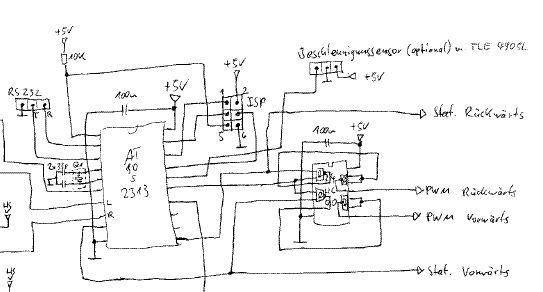 Du brauchst nur einen PWM wenn du den einen Pfad (A) mit statischem Signal und den Anderen (B/) mit PWM ansteuerst. Mit einem 7400 kannste den PWM mit einem statischen Signal von Vorwärts auf Rückrarts umschalten (von B/ auf A/).