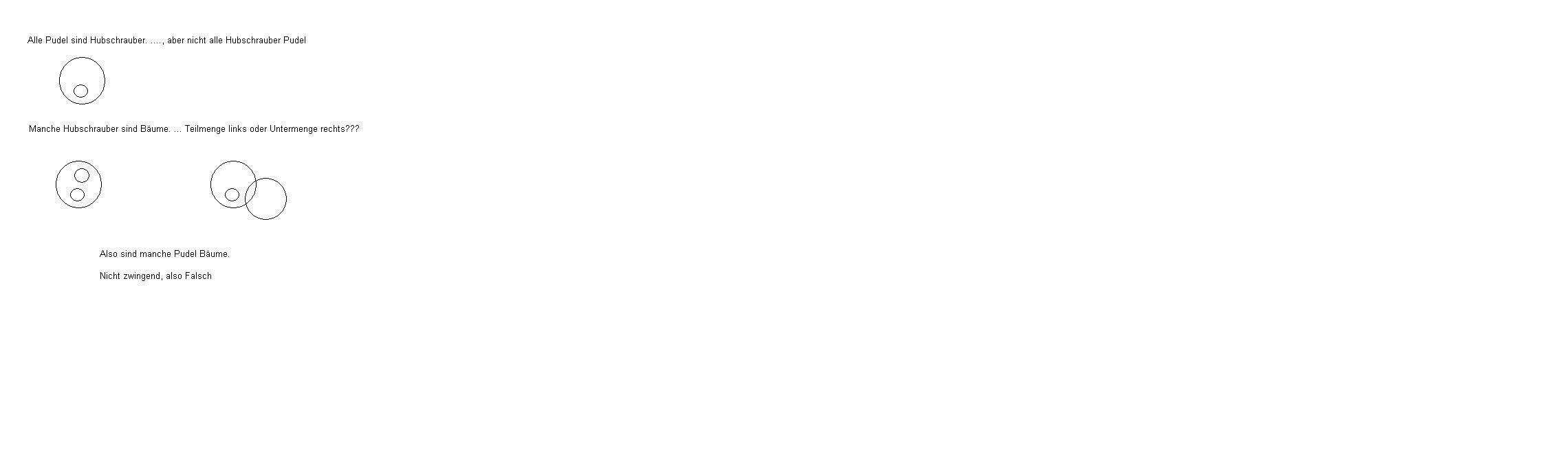 > (1) Alle Pudel sind Hubschrauber. > (2) Manche Hubschrauber sind Bäume. > (3) Also sind manche Pudel Bäume. Das bedeutet: (1) Die Menge "Pudel" ist eine TEILMENGE der Menge "Hubschrauber". Oder: "Pudel" ist in "Hubschrauber" ENTHALTEN. (2) Die SCHNITTMENGE zwischen "Hubschrauber" und "Bäume" ist nicht leer. Oder: "Hubschrauber" und "Bäume" ÜBERLAPPEN sich. (3) Also ist die Schnittmenge zwischen "Pudel" und "Bäume" garantiert nicht leer. Oder: Also überlappen sich garantiert "Pudel" und "Bäume". Auflösung: "Pudel" und "Bäume" können sich zwar überlappen, aber es ist nicht garantiert, dass sie es tun (siehe Skizze im Anhang). Deshalb ist die Folgerung (3) falsch.