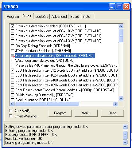 Da sollte aber ein Häkchen sein, nicht? So wie ich das sehe, müßtest Du den Controller HV-programmieren und die SPI-Fuse wieder einschalten. Dann kannst Du wieder über ISP an den Controller ´ran. Das Lesen von $FFFF kommt mir ein wenig spanisch vor. Klappt das Auslesen der Signatur?