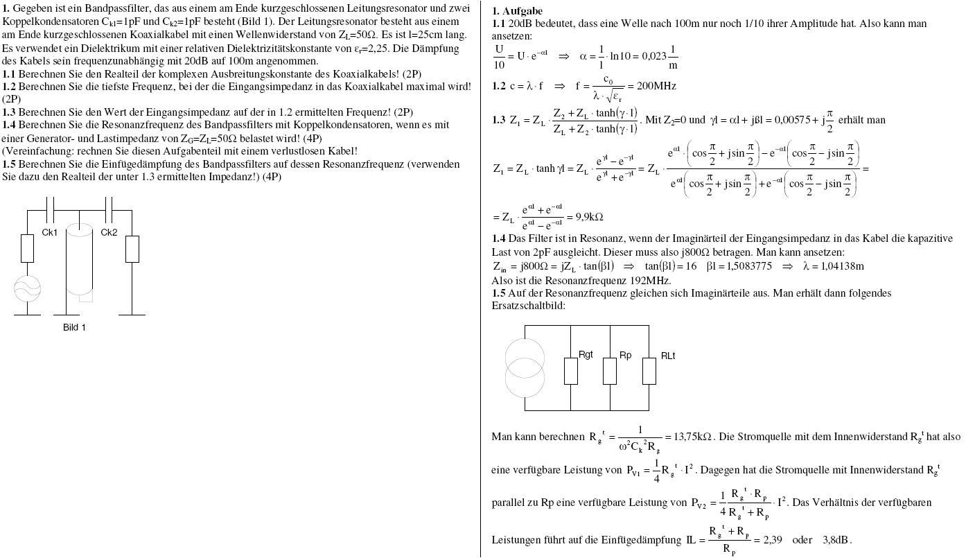 Hallo, im Anhang befindet sich eine Aufgabe mit Lösung zum Thema Bandpassfilter. Zum einen verstehe ich nicht warum da 9,9 KOhm herauskommen. Ich habe es nachgerechnet es müssten 8,69kOhm sein. Zum zweiten steht da für Zin = j800 Ohm. Das müssten doch j400 Ohm sein oder. 1/(j*w*2pF) = -j400 Ohm --> Zin = j400 Ohm Die letzte Teilaufgabe müsste doch auch falsch sein: Rg^t = 14,538 kOhm RL^t = 14,538 kOhm Rp = ZL = 8,69 kOhm Rges = Rg^t || RL^t || Rp = 3,958 kOhm verfügbare Leistung Pv1 = 1/4 Rg^t * I^2 verfügbare Leistung Pv2 = 1/4 Rges * I^2 Einfügedämpfung IL = Pv1/Pv2 = 3,67 --> ca. 5,6dB