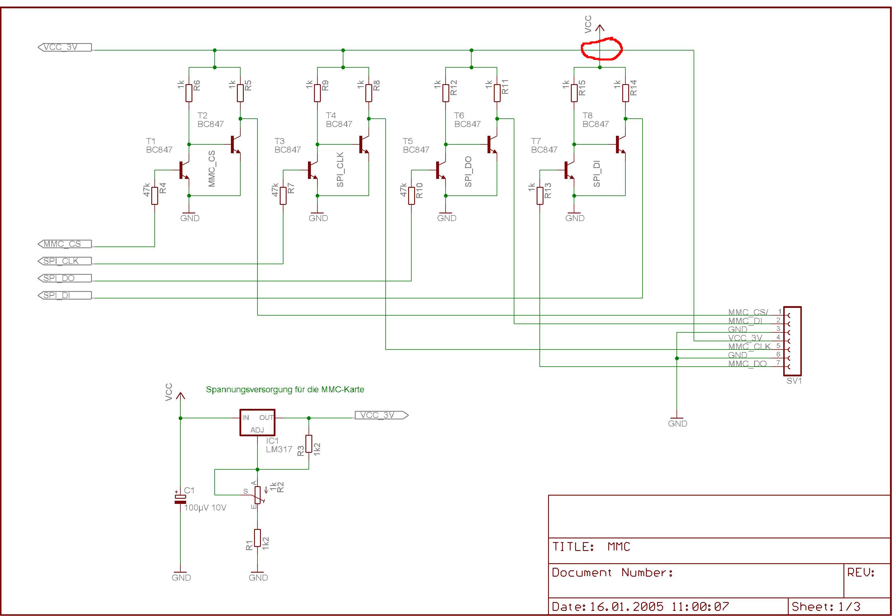 Zu den Transistoren: Der Buchstabe zuhinterst ist die Verstärkung. Zur Junction: Die sollte da auf keinen Fall hin, der Pfeil geht auf VCC vom Controller (5V) und die Leitung oben ist die Stromversorgung für die Karte (3.3V).
