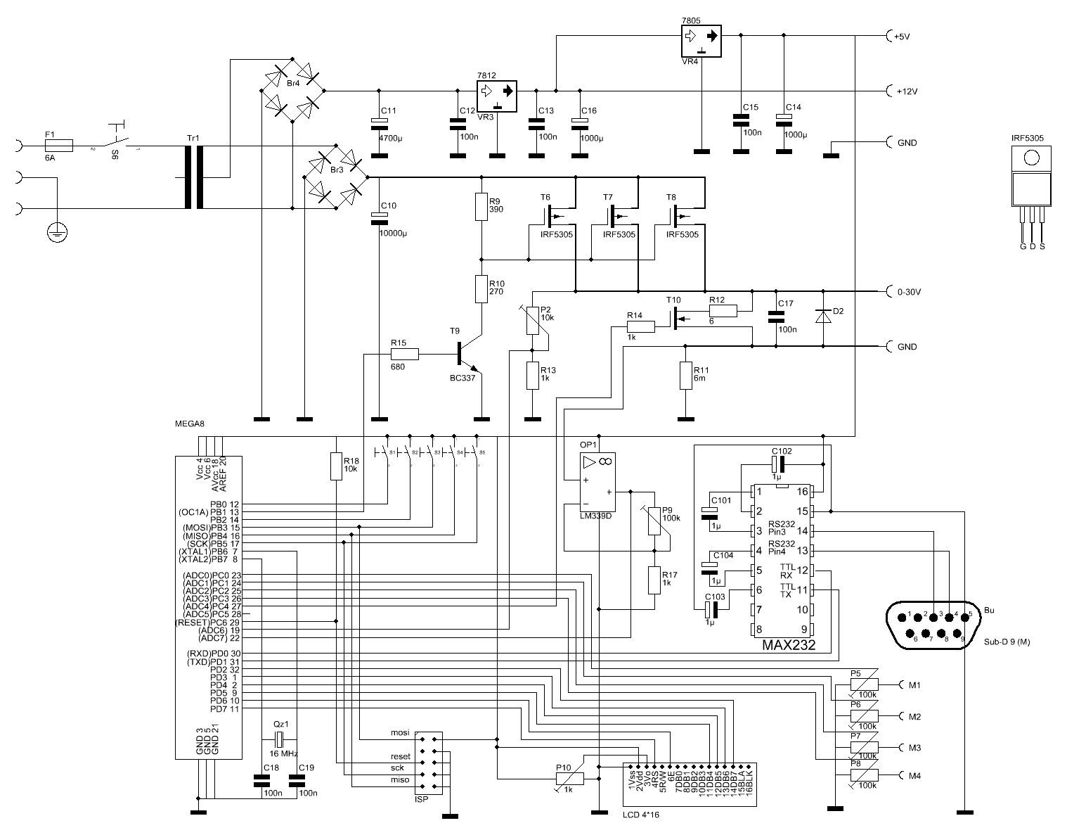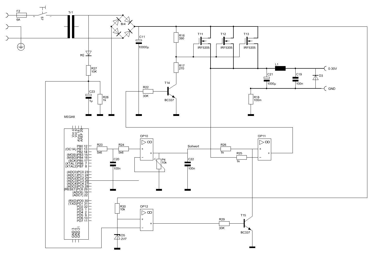 Hallo, Nachdem mein Netzgerät mir jahrelang treue Dienste geleistet hat, ist es jetzt in den Elektronikhimmel. Ich hoffe es ruht in frieden… Ich möchte mir nun ein neues bauen, 0-30V max.7A. Das ganze soll über 3 parallelen IRF5305, die ein PWM Signal von einem Mega8 TQFP bekommen, geregelt werden. Bevor der Mega8 sich Langweilt, sind 4 Messausgänge max. 30V nach außen geführt. Angezeigt und Bedient wird das ganze über ein 4*16 LCD und 5*Tasten (+, -, hoch, runter und Enter). Ach ja, Akkus soll man auch entladen und landen können (Delta-U-Abschaltung). Fürs entladen R12/T10. Mein Problem ist die Strommessung. Über R11 (6mOhm) fallen bei 7A 0,042V ab. Ein OP verstärkt es um 81,3, das ein auswertbare Spannung für mein Mega8 entsteht. Soviel zu Theorie, funktioniert das ganz auch so wie ich mir das vorstelle? Bedenken habe ich auch bei der Ansteuerung der T6-T8. Hat jemand noch Verbesserungsvorschläge? Vielen Dank Gruß Olli