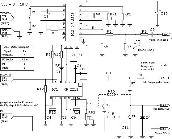 Was für eine Funke ist das? Sollte es ein Handfunkgerät sein, dann gehen Modulation und PTT beide über eine Ader. Lösung in diesem Falle: R14 installieren und nur GND und MIC an den Mikrofonstecker anschliessen. R14 muss zwischen 1.5 und 4,7kOhm sein, der Wert sollte so hoch gewählt werden, daß das Funkgerät noch zuverlässig durchschaltet. meistens so um 2,2 - 2,7kOhm. GND und LS kommen dann auf den Ohrhörerstecker. Nochwas, PTT-Handbetrieb kann man auf Packet vergessen, das Timing bekommt man manuell nicht hin. Gruss Jadeclaw.