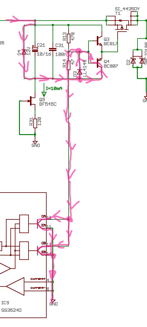 @Jörg: Die Ausgangsspannung ist auf 5Volt festgelegt. Aber ich kann gern eine hohe Eingangsspannung anlegen, und irgendwelche Ströme messen.... "Falsch, der Strom fließt über R13 und dann ...." Er fließt von Ub über R13, dann über Q4 (B=>E), dann über D3 Z-Diode... HÄ????? Wie meinst du das?? Welcher R3 ? das halbe Jahr müssen wir warten, die Schaltung ist erst zwei Monate alt "Das ist prinzipiell auch falsch. Je nach Anwendung..." Welche soll das sein..? Nun. Warum soll die Ansteuerschaltung absterben? Stirbt der FET (Hitze) dann macht dieser Kurzschluss => Surpressordiode => Sicherung. Es ist natürlich denkbar, das dieser Kurzschluß den Q3/Q4 mit tötet, hier wäre der Gatewiderstand sicher geeignet, das zu verhindern...