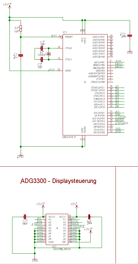 Hallo Leute, mein Kollege und ich hängen an unserem Maturaprojekt fest. Wir festen einen ATMEGA 16P, welcher mit 3.3V versorgt wird. Wir möchten mit diesem Prozessor ein 5V Display über den PORTC ansprechen. Da wir mit unterschiedlichen Spannungen arbeiten, haben wir einen ÁDG3300 von Firma Analog Devices zwischen die beiden Bauteile gehängt. Ein ADG 3300 ist ein Logic Level Translater welche einfach die 3.3V auf die 5V wandelt. Wir haben nun folgendes Problem. Wir können zwar erfolgreich auf HIGH gehen, aber wenn der Prozessor wieder auf LOW geht bleibt der HIGH Zustand am Display erhalben. Vielleicht kennt jemand von euch das Problem und kann uns helfen. Danke im Vorraus. mfg Martin
