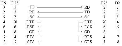 Könnte auch an der Com-Einstellung liegen(7/8 Bit,Parity, Protokoll...). Hast du die Handshake/Statussignale auch beschaltet ? Zwischen zwei DTC's wird meist ein Null-Modem-Kabel verwendet (siehe Anhang).