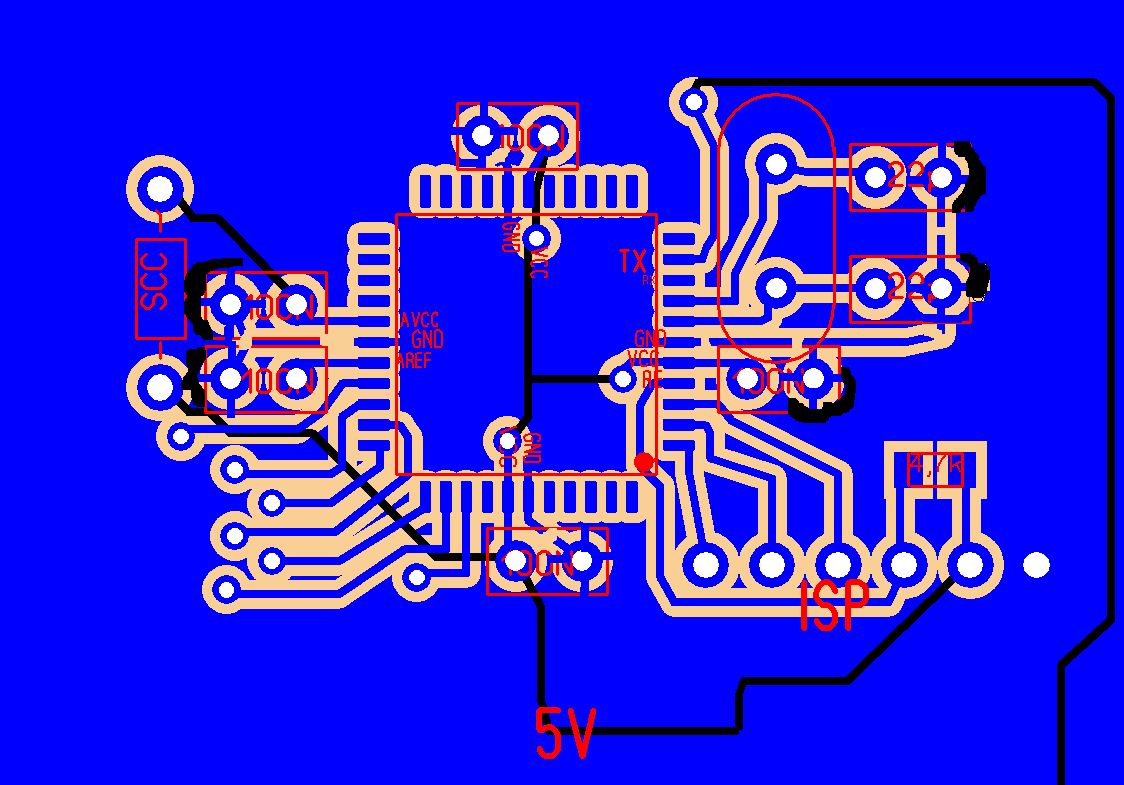 So, habe jetzt aus Verzweiflung an jeden der 3 VCC von unten, damit schön nahe am Pin, an die 100N 22µ Elko rangelötet - keine Verbesserung. Was mir aufgfallen ist, daß das Problem nur auftritt, wenn ich den TX-Pin der Sendeeinheit mit dem RX-Pin der Empfangseinheit verbinde. Selbst mein Test mit einer schon lange als Sendeeinheit befindlichen Platine brachte Probleme sobald TX-RX verbunden worden sind. Durch Zufall ist mir dann aufgefallen, daß die ganze Sache ganz schön strahlt. Die Sendeplatine ist mit einem RJ45Kabel/Stecker mit der Haupteinheit verbunden. Das ganze RJ-45 Kabel inkl Stecker zazber schöne Zickzackmuster auf dem Oszi dar. Und nun das Schlimmste: das "Zucken der Masseleitung" am Oszi kommt NICHT von der Masseleitung, sondern über der KOMPLETTEN Sendeplatine. Die komplette Sendeplatine sondert diese Zuckstörungen auf dem Oszi hervor. Erst wenn ich den ISP (AVR MK II) raufstecke, mindert sich die Strahlung auf "nur" ca Auf der Empfangsplatine ist noch der RJ-45-Stecker von der Sendeplatine gestört, aber die Leitungen selber auf der Platine sind Störungsfrei. Da dies Platine ja auch sendet, aber Problem und Störungslos bin ich ratlos. Warum veranlaßt die Sendeplatine solche Störungen? Ich hatte auf fehlende Abschirmmasse (Herstellungsfehler oder so) getippt, aber nach dem ich zig Stellen auf beiden Seiten der Sendeplatine freigekratzt habe und da immer Masse anlag, auch das nicht möglich. Einen Masseversatz von der Empfangsplatine (auf der sitzt der 7805) zur Sendeplatine gibt es auch, ca 2,9mV. Woran kann es liegen,daß die Sendeplatinen so arg stört? Bei einer Empfangplatine mißbraucht als Sendeplatine (Pinkompatibel, einfach nur Brücke von RX auf TX) bleibt alles ruhig. Kein RJ45 zackt eine Linie auf dem Display noch selber schwingt die Platine auch nur ein bißchen.....