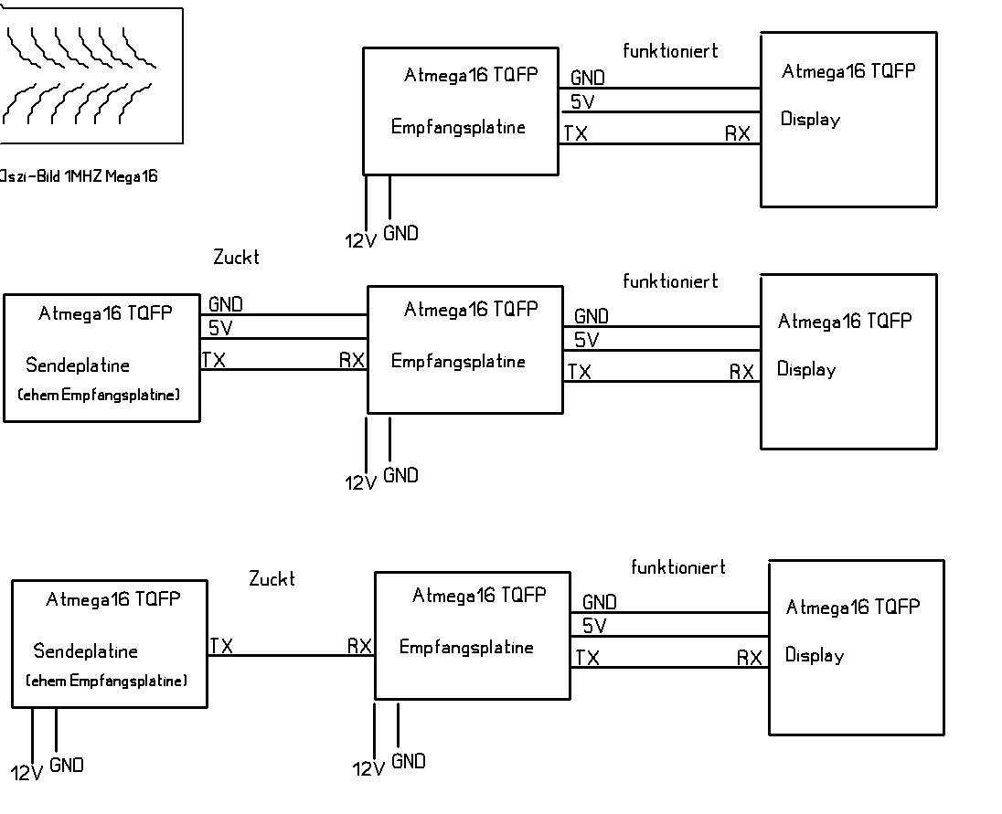 Ich weiß ja, daß Cat5 bestens geeignet ist, aber es blieb die einzige Möglichkeit. Allerdings ist das jetzt auch ausgeschlossen, habe ebend die gute alte Freiverdrahtung gemacht (so wie früher bei der "Entwicklung" und den ersten Tests) und auch da das Zucken..Wie hat mein Großvater immer gesagt "Früher war das aber nicht so" - was in dem Fall auch stimmt... Habe nun einfach die umgemodelte Empfangsplatine jetzt eigen mit 7805/Elko/100N etc versorgt und an die selbe Autobatterie angeschlossen und nur RX-TX verbunden, aber auch ein Zucken und nur jede 4 Ziffer wird übertragen. Auf beiden Platinen ist nichts mehr drauf, der rs323-chip ist eh nur gesockelt und war nie drauf. Ich habe sogar die Transistoren für die LED's abgekniffen, um auf Nummer sicher zu gehen. beide Platinen brauchen exakt 26,9mA, so zumindest mein Multimeter, da bewegt sich nichts. Selbst wenn ich auf 1mHz den atmeger runterschalte (da wird das Zucken von Oszi zu einer "Pfeilspitzen-Grafik" mit wesentlich mehr Intensität) und sich der Verbrauch fast halbiert und das zucken nur alle paar Sekunden kommt,bleibt das Multimeter fest bei 16,08. Habe nun einen 10ohm in die Versorgungsspannung auf der 12V seite eingelötet, um vielleicht einen Spannungsabfall/Anstieg messen zu können, fals das Multimeter im Ampere-Modus zu träge ist. Aber auch da bleibt der Spannungsabfall konstant beim Senden, während das Oszi die Zuckungen auffängt... Nun bin ich absolut ratlos. Weil aus meine Experimentalzeit weiß ich noch, daß "Klingeldraht" ausreicht, um zu senden/empfangen. Und die Display-Platine wird ja auch so betrieben, nur wenn ich halt noch eine Platie ranschalte, klappt es damit nicht -aber die Display-Platine läuft stabil... Ich gehe mal davon aus, daß vielleicht die Atmegas einen Schuß weg haben. Es sind zwar alle (Sender, Empfänger, Display) aus der gleichen Charge, aber etwas anderes kann es einfach nicht sein, wenn nicht mal das ganz normale Freiverkabeln mehr geht ps: habe wie angeregt einmal 1k und einmal 10k in die Sendeleitung eingebracht. und siehe da, die störungen sind nur noch näher am Pin meßbar.bei 10 K reicht schon 2cm aus und nichts mehr ist meßbar
