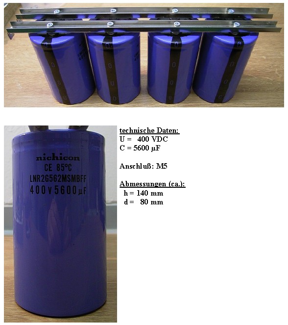 Hallo, ich biete: 4 Stk. Elkos 400VDC / 5600 µF Die Kondensatoren sind gebraucht und stammen aus einem alten Frequenzumrichter. Habe leider keinen Verwendungszweck dafür. Daten: siehe Anhang Preis: macht mir ein gutes Angebot ;-) bei Interesse: tobiaspaul@gmx.net