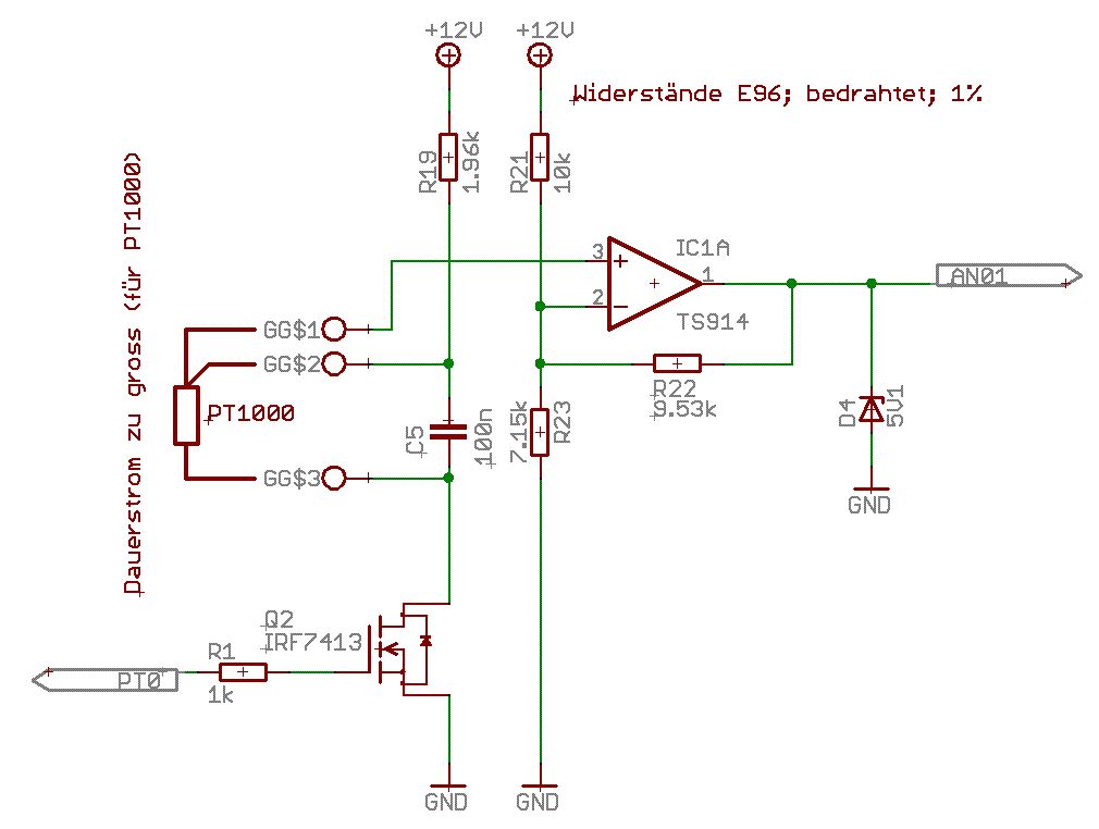 Hallo zusammen, ich möchte eine Auswerteschaltung für einen PT1000 bauen. (siehe Schaltung im Anhang) und hätte gerne Rückmeldung, ob die Dimensionierung so hinhaut. Vorgaben: - Temperaturbereich: -20..+100°C (zur Lufttemperaturmessung) - Genauigkeit (im vollen Bereich) sollte nicht schlechter als 2°c werden; ich Bereich +10..+30°C hätte ich gerne 1°C Genauigkeit. - Schaltung soll ohne Bauteileabgleich auskommen (d.h. kein Poti zum einstellen); ein Abgleich per Software wäre i.O. falls es nicht anders geht; ein TypK-Thermometer zum Abgleich steht zur Verfügung - Erfassung der Temperatur mittels µC (10Bit-ADC; Referenz 5V) - 3-Leiteranschluss des Sensors (Zweileiteranschluss reicht nicht aus, da bis zu 20m zu überbrücken sind). 1.) Da meine Rechenkünste in bezug auf OPV-Schaltungen sehr mager sind, habe ich die Daten in: http://www.stegem.de/Elektronik/OP3/op.html eingeben und die Widerstandswerte für meine Schaltung übernommen. Kann jemand bitte kurz überschlagen, ob die Werte so hinkommen, oder ob sie total deneben liegen. 2.) Da der Dauerstrom durch den PT1000 zu hoch wäre, habe ich einen MOSFET (IRF7413) als Lowsidetreiber eingeplant. Dieser wird von einem normalen 5V-Prozessorausgang angesteuert und nur zur Messung eingeschaltet. Sollte so ja auch kein Problem sein? 3.) Da der OPV mit 12V versorgt wird, und damit auch (theoretisch) Spannungen bis 12V am Ausgang liefern kann, habe ich eine 5,1V-Zenerdiode vorgesehen. Ist da noch zusätzlich ein Reihenwiderstand vorm AD-Eingang notwendig oder ist dieser hochohmig genug? (~100k Eingangswiderstand). 4.) Messfehler: Ich möchte noch eine Abschätzung machen, wie genau meine Schaltung die Temperatur messen kann (ohne Abgleich). Aus dem Bauch heraus habe ich 1%-Widerstände genommen. Wie geht man da konkret vor? Kann jemand aus Erfahrung einen Daumenwert nennen, ob meine 2°C/1°C Genauigkeitsvorgaben so erfüllbar sind? PS: Die Forumssuche hat mir leider keine konkrete Schaltung geliefert, die für meine Zwecke verwendbar gewesen wäre. Optimal wäre: http://www.umnicom.de/Elektronik/Schaltungssammlung/Temperatur/Pt1000/Pt1000.html Kapitel 7.3.4 gewesen. Leider gibts hier keine Anwendung als Dreileiterschaltung. :-( Gruß, Richard