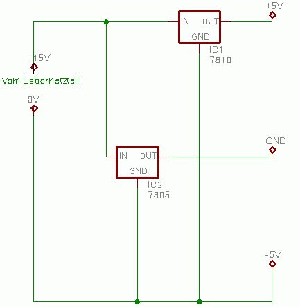 Hallo, allerseits! Ich wollte den angehängten (vereinfachten) Schaltungsentwurf für eine symmetrische Spannungsversorgung mal zur Diskussion stellen. Ausgangspunkt ist folgender: Ich habe ein Labornetzteil, was mir 15V geregelt ausgibt, galvanisch vom Netz getrennt. Nur leider halt nicht symmetrisch. Die angeschlossene Audio-Schaltung benötigt aber +/-5V und Masse, symmetrisch. Da ich beim Labornetzteil keine Mittenanzapfung der Sekundärwicklung habe, kam ich nun auf die Idee, mir einfach die Spannungen umzudefinieren und mir den Mittelpunkt (GND) mit einem weiteren Spannungsregler herzustellen. Die Kondensatoren an den Spannungsreglern habe ich der Übersicht halber weggelassen. Nun meine Frage: wo seht Ihr Probleme bei dieser Schaltungsweise? Dass solch eine Schaltung ausschließlich bei einer galvanischen Trennung vom Netz funktioniert, versteht sich von selbst. Aber bietet eine solche Schaltung bei einem Trafo ohne Mittenanzapfung nicht eine Möglichkeit, mir trotzdem eine symmetrische Spannungsversorgung herzustellen? Sachdienliche Kritik an dieser Schaltung ist ausdrücklich erwünscht! Greetz kmt