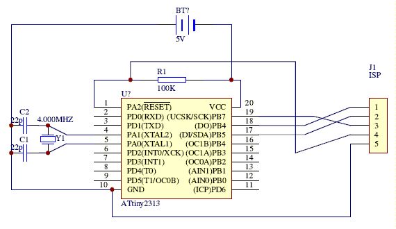 hallo! ich habe mir 3 Tiny2313 bei Pollin gekauft, und dazu 3 4MHz Quarze. ich wollte den controller bei Ponyprog so fusen, dass er mit einem 4 MHZ Quarz schwingt. Die Verbindung (ISP) funktionierte Problemlos, ich habe die FuseBits gelesen, und habe folgende Fuses geschrieben: CKDIV8 = 1 DWEN = 1 CKOUT = 1 EESAVE = 1 SUT1 = 1 SPIEN = 1 SUT0 = 1 WDTON = 1 CKSEL3 = 1 BODLEVEL2 = 1 CKSEL2 = 1 BODLEVEL1 = 1 CKSEL1 = 0 BODLEVEL0 = 1 CKSEL0 = 1 RSTDISBL = 1 SELFPRGEN = 1 Sofort danach meldete Ponyprog "device missing or unknown device (-24)" Danach konnte ich weder lesen noch den controller beschreiben... so habe ich schon 2 tinys abgeschossen.. was kann ich machen? Muss ich den Quarz beim Programmieren der Fuses Auslöten? PS: ich benutze folgende Programmierschaltung: (Siehe Anhang) Ich weiss dass im Ponyprog eine 0 Häkchen setzen bedeutet Vielen Dank mr-unbekannt