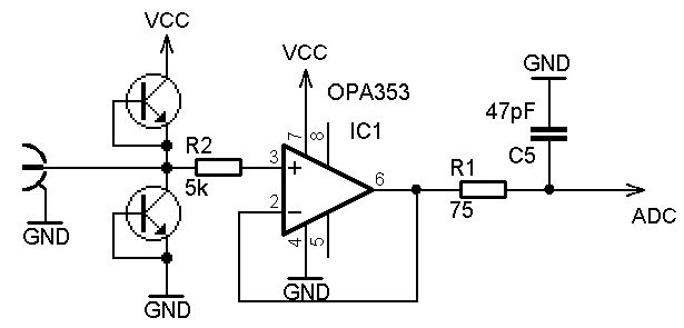 Transistoren anstatt Diodenn wegen der geringeren Leckströme verwende ich auch. Allerdings muss dein Widerstand R2 zwischen Eingang und Transistoren, damit beim Durchschalten der "Dioden" an R2 ein Spannungsabfall entsteht und auch deren Strom begrenzt wird. Bei der jetzigen Schaltung passiert bei Überspannung folgendes: Die Spannung treibt einen großen Strom durch den Transistor, zerstört den und kann dann, wenn auch jetzt über den Widerstand, voll "wüten". Wie benedikt bereits geschrieben hat, verfügen fast alle OPVs über interne Clamp Dioden, aber die sind für mich nur die Notbremse. Was passiert wenn ein alternativer OPV verwendet wird der eine andere Innenbeschaltung hat? An den paar Cent sollte es nicht mangeln.
