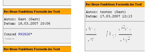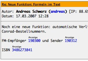 Unter IE 6.0 (+Intranator Proxy) erscheinen keine Formelgrafiken s.o. PNG kann grundsätzlich dargestellt werden. Der URL sieht vorübergehend so aus: http://www.mikrocontroller.net:3001/math/27f7f150b6d3761ab1427c74eded53d7.png?source=%0D%0Af%28x%2Cy%29+%3D+_%7B-%7D%0D%0A Vielleicht mag euer Proxy/Firewall den Port 3001 nicht. Aaaah, jetzt hab' ich's auch gesehen. Das ist wohl in der Tat so (firewall) - habe da aber leider keinen Einfluss drauf. Habe gerade den Port umgestellt, jetzt sollte es bei allen funktionieren. Schöne Sache. Vielleicht könnte man den Bild-Hintergrund noch an die graue Farbe der Postings anpassen? Oder das PNG gleich durchsichtig erstellen? Gruß, Roland Jetzt sind die Formeln transparent. Wäre nett wenn das mal jemand im Internet Explorer testen könnte, der hat so seine Probleme mit transparenten PNGs. Also der IE 6.0 stellt die bei mir nicht korrekt dar, siehe Anhang. Sieht toll aus, zumindest in einem Browser, der das kann (im Anhang: Konqueror). Der IE6 scheint bloß Pixel mit 0% oder 100% Transparenz zu unterstützen, da bringt das natürlich nichts. Dann bleibt nur noch der etwas unschöne Ausweg der grauen Hintergrundfarbe, wenn es nicht wieder weiß werden soll. Gruß, Roland Ich kann nur vom IEX 7 berichten, da scheints zu funktionieren, wobei die Grafikengine irgendwie Müll ist. Manchmal sind ganze Textzeilen nur halb und manchmal garnicht dargestellt, markiert man sie, werden sie sichtbar... böses Programm. Da war ein Bug im Workaround. Funktioniert es vielleicht jetzt? Wenn nicht, dann muss ich wohl doch mal wieder meine Windows-Kiste anschließen. Der IE7 kann das mit der Transparenz immer. Das Problem sind IE 5.x und 6. Der Workaround sollte bei IE 5.5 und 6 funktionieren. ja, sieht scheisse aus. aber im IE6.0 sollte das gehen. Aber egal, wer den IE benutzt ist selbst schuld :) In weiß (erste Version) gings auch im IE5 bestens. Jetzt geht's nimmer... ... Na sowas. Mit IE 5.5 funktioniert es, mit IE 6 nicht: http://browsershots.org/screenshots/132f364568afe89ca2fd1b1602e95f75/ Noch eine neue Funktion: automatische Verlinkung von ISBNs und Conrad-Bestellnummern. FM-Empfänger 190300 und Sender 190312 ISBN 3486273841 Muss man da irgendeine spezielle Syntax beanchten oder wird einfach jede 6-stellige nummer ersetzt? Funktioniert ja bisher sehr gut und du bekommst dadurch noch etwas Geld nebenbei und das auch noch ohne zusätzliche werbung ;) Find es gut das man so ein riesen Projekt gut mit werbung finanzieren kann und da klicke ich schon das ein oder andere mal "aus versehen" auf die google banner ;) Ein test: Sonderangeot!!! 154081 Äh, und wie funktioniert das? Ist jetzt jede sechsstellige Nummer eine Conrad-Bestellnummer? Mal sehen: 190300 192003 123456 654321 987654 Hmm. Das ist vielleicht doch ein wenig unausgereift, oder? Was wäre davon zu halten, wenn hier eine spezielle Syntax wie "Conrad:123456" verwendet werden müsste? hmm seltsam... nicht jede nummer funktioniert... 154081 - 62 154081-62 154081 Verlinkt werden alle 6-stelligen, freistehenden Zahlen, wenn in dem