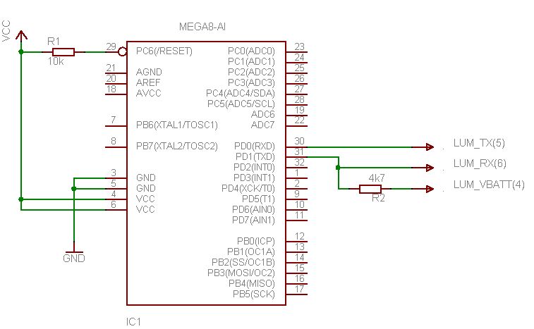 Habs so ähnlich gemacht wie Du: TX direkt mit 6 und RX direkt mit 5 verbunden - siehe Zeichnung. Dazu müssen die Pegel aber passen. Handy und ATMega laufen bei mir mit 3,3V. Und dann eben der Pullup von Pin 6 nach Pin 4. Hast Du das STK500? Dann versuch doch erstmal mit dem internen Spare-Port Daten an den PC (Hyperterminal) auszugeben. Dann lässt sich auch eher abschätzen, obs vielleicht ein Problem mit der Baudrate ist.