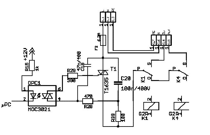 Achtung! Hier ist der Kontroller über das Gate mit der Starkstromseite verbunden. Auf jeden Fall muss ein Optokoppler zwischen Starkstromseite (Triac) und Kleinspannungsseite (Kontroller) geschaltet werden.