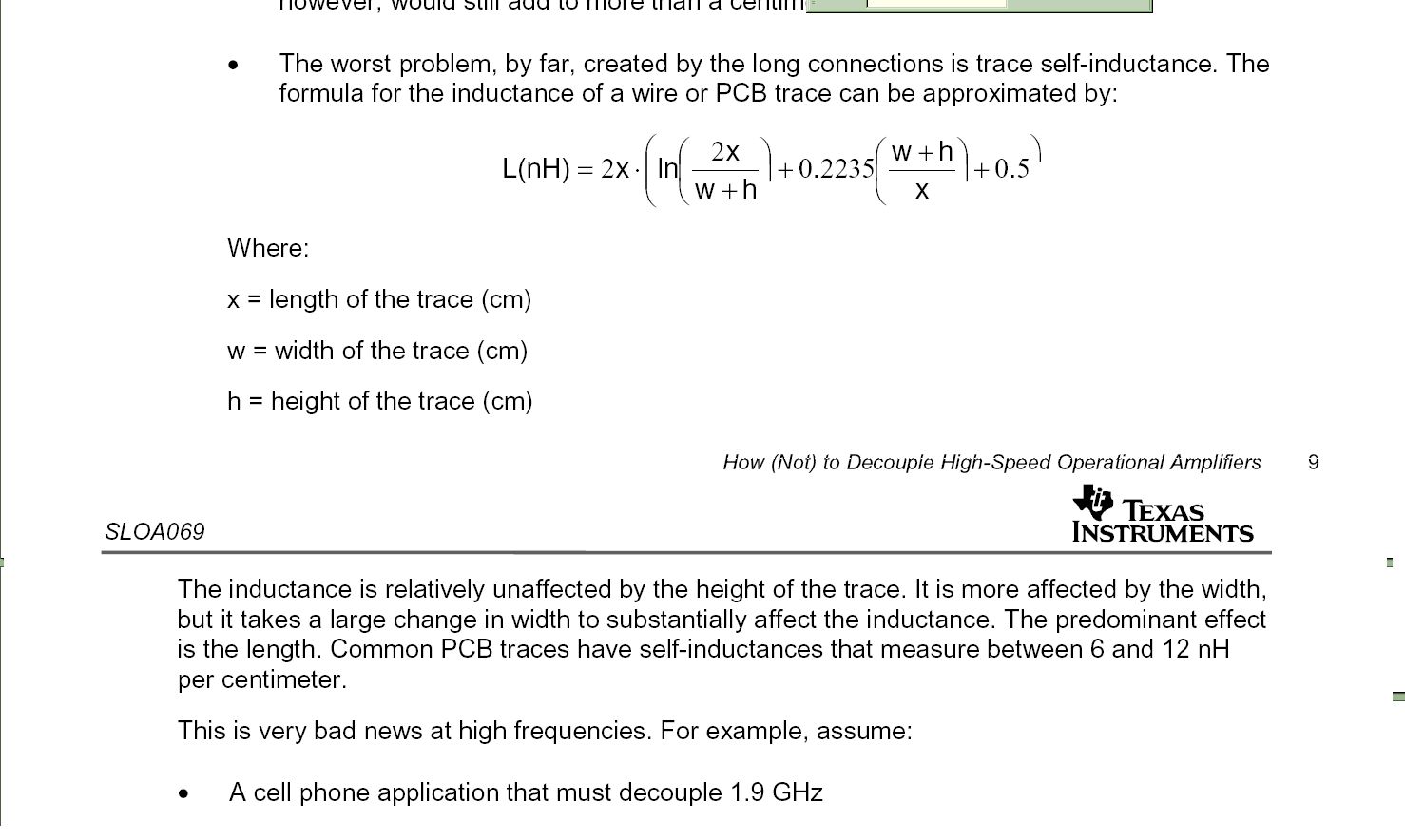 Also wenn ich dem Autor in obigen Link folge Parasitic Inductance of Bypass Capacitor II http://www.signalintegrity.com/Pubs/news/6_09.htm und mir die verschiedenen Pad Formen vs. Induktivität anschaue (603 Skinny vs. 603 Fat), so sehe ich auch wieder, dass wenn schon Leitung, dann möglichst breit um L zu senken (wie auch in obiger Formel)