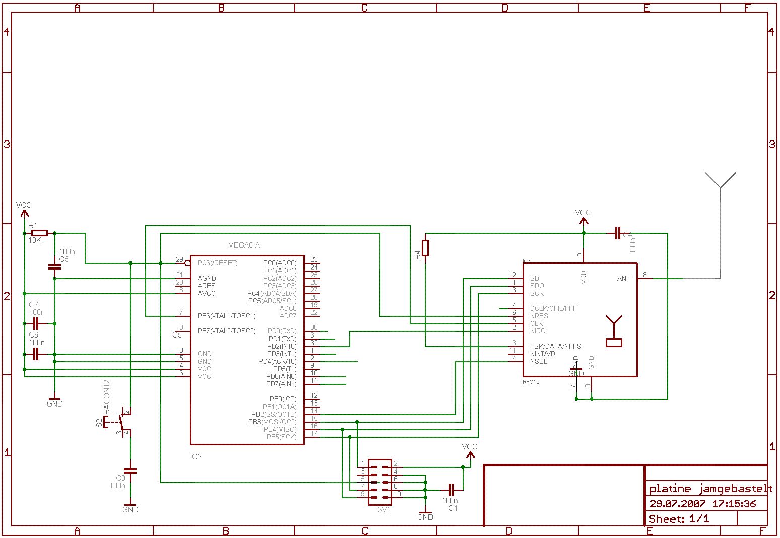 Hallo Leute, ich eine platine aufgebaut getestet und auf externe Fusebits eingestellt und seitdem kann ich nicht mehr das programm in den µC reinprogrammieren. Im Anhang stelle ich das schaltplan. Ich benutze dazu das Funkmodul RFM12. Was habe ich bei den Schaltplan falsch gemacht bzw. darf ich mit isp schnittstelle so programmieren wenn der µC auf externe Quarz eingestellt ist und diese vom RFM12 zugegrifen wird. Kann mir jemand was dazu sagen? Danke! lg Timo