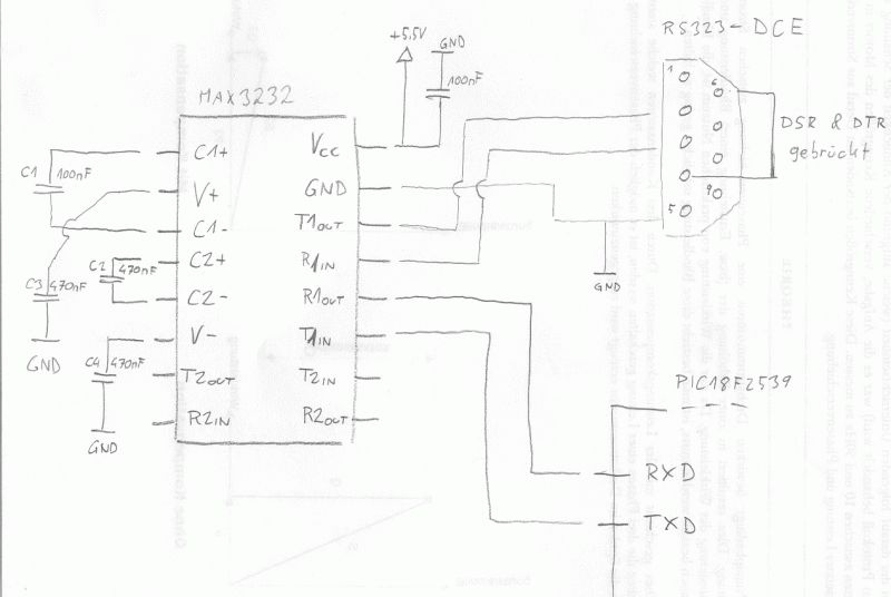 Hallo, die Spannungen sollten so um +9V/-9V an V- und V+ sein. 470n kommt mir ungewöhnlich vor, der 3232 müßte ein Version für 100n sein, die Werte sollten bei allen möglichst eingehalten werden. Gruß aus Berlin Michael