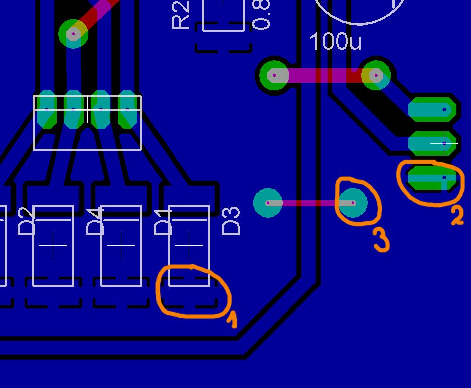 Nachdem ich alle Leitungen bis auf GND verlegt habe und ein Polygon um die gesamte Platine gelegt und mit GND benannt habe, verbindet Eagle ja alle GND-Kontakte mit dem gefüllten Polygon. Nun ist es manchmal so, dass einige Flächen abgegrenzt sind. Deswegen baue ich nachträglich Brücken ein. Dabei gibt es aber nicht diesen "Abgrenzungseffekt" (3), wie bei anderen Pins (1 und 2). Auch wenn ich zuerst die Brücke erstelle und dann das Polygon drüberlege, sieht es genau gleich aus. Wie kann man das machen?