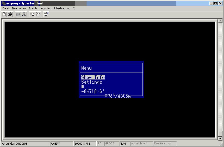 Da hier anscheinend schon einige den USBAVR-ISP gebaut haben: Funktioniert bei euch das Menü im Terminalmodus ? Bei mir gibt es keine Möglichkeit die Geschwindigkeit einzustellen, dafür gibt es noch eine 3. Auswahlzeile mit Hyroglyphen. Wenn ich das auswähle hängt sich Hyperterminal auf (da anscheinend der AVR abgestürzt ist).