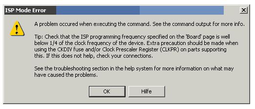 Beim programmieren bekomme ich relativ oft diesen Fehler. Ist das ein Problem mit der ISP Verbindung oder mit der Vebindung PC-Programmer ? Wird die Einstellung des Programmiergeschwindigkeit eigentlich gespeichert ?