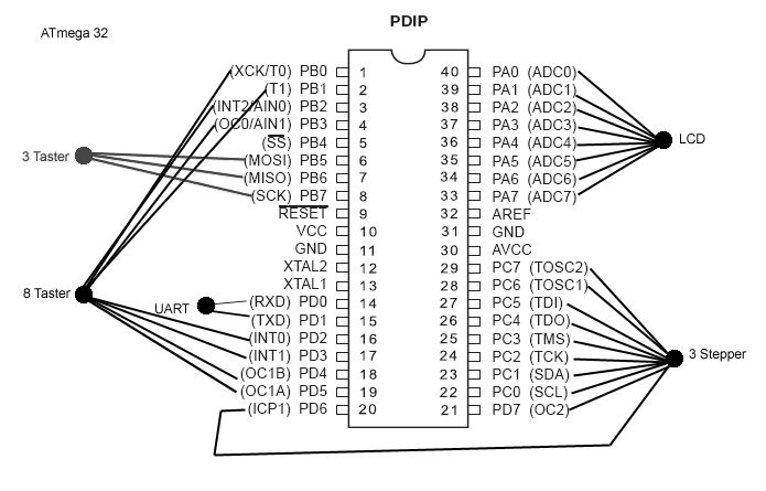 Hi, ich wollte mal fragen, ob ich meine Mega32 so belegen kann. Zum Anhang: Alles was schwarz ist funktioniert und alles was rot ist will ich neu dran machen. Ich weiß allerdings nicht was passiert wenn ich taster (ohne pullup) an die ISP-Leitung hänge... Der Rest ist schon minimal belegt, kann also nichts ändern. jonny