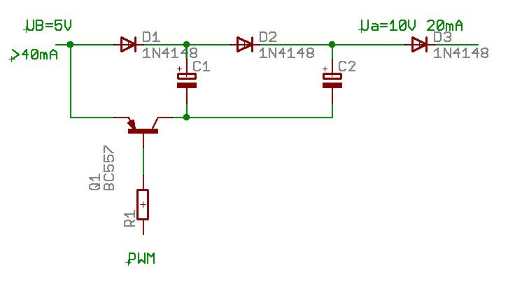Hallo ich hab mal ein paar Werte gemessen. Daraus folgt: Das PWM-Signal sollte ab 10mA Last nicht mehr direkt eingespeist, sondern verstärkt werden. Die PWM Frequenz könnte höher sein. Die Dioden sollten Typen mit geringerer Flusspannung sein. (0,3 statt 0,7) Die Erhöhung der Kondensatoren auf 100µ brachte kein Erfolg. Wigbert