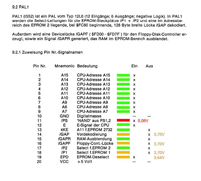 Hallo, ich habe ein Problem mit einem alten Eltec Eurocom-Board auf Basis einer 6809 CPU. Darauf befindet sich ein Eprom dessen Adressbereiche von einem PAL dekodiert werden. In der Serviceanleitung steht dazu: PAL1 (IS52) ist ein PAL 12L6 (12 Eingänge, 6 Ausgänge, negative Logik). In PAL1 werden die Select-Leitungen für die EPROM-Steckplätze /P1 + /P2 und eine im Adressbereich des EPROM2 liegende, bei $FC80 beginnende, 128 Byte breite Lücke /GAP dekodiert. Außerdem wird eine Devicelücke /GAPF ($FD00 - $FD7F) für den Floppy-Disk-Controller erzeugt, sowie ein Signal /GAPR generiert, das RAM im EPROM-Bereich ausblendet. Wenn ich allerding mit dem Oszilloskop die Pins von PAL1 checke, erhalte ich keinerlei Pulse an den /GAP und /GAPF Ausgängen. Sollte hier nicht ein Puls messbar sein? Hier habe ich jedoch nur log. "High". /GAPR wird generiert, hier sehe ich einen Puls. Wie äußert sich denn eine 128 Byte breite Lücke auf dem Oszi? Cornel