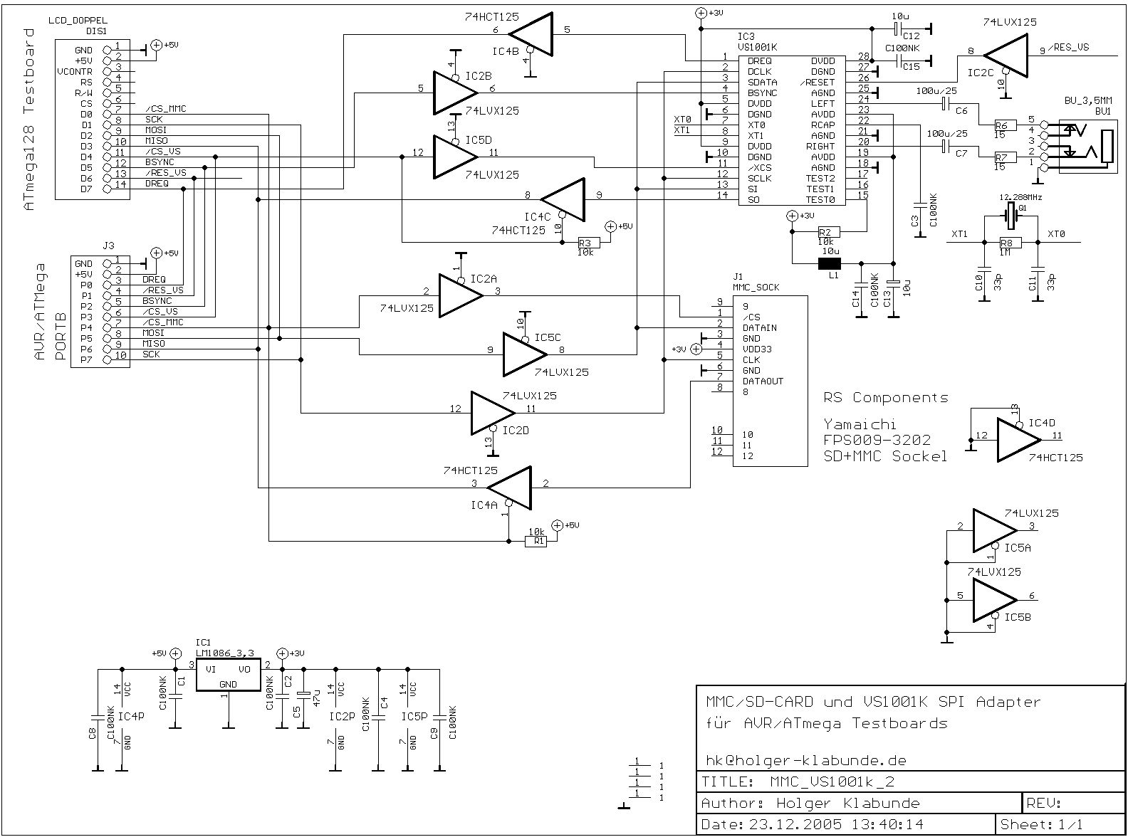 Es gibt keinen kompletten Schaltplan. Ist alles nur so zusammengefummelt. Hab mal den MMC/VS1001 Plan drangehängt. Das ist ein Modul zum anschliessen an mein selbstgebasteltes ATmega32 Testboard. Der ATMega läuft mit 5V und 16MHz. Ist also eher für stationären Betrieb gedacht. An Portd ist noch ein Standard Textlcd 2x40 dran. Im 8Bit Modus, was für eine Verschwendung ! Am Int0 Eingang hängt ein TSOP1736 zum empfangen von RC5 Codes. Als Fernbedienung tuts bei mir ne alte von einem kaputten Philips CD-Player. An Porta habe ich 8 Taster für die üblichen Playerknöpfe. Viele Funktionen hat der Player noch nicht. Einschalten und die Songs werden einer nach dem anderen abgedudelt bis man ihn abschaltet. Mit den Knöpfen/der Fernbedienung kann man dann auf den nächsten/vorherigen Song springen, Pause, Stop,Play und Lautstärke. Also das übliche. Das Programm merkt sich auch noch nichts. Weder den zuletzt gespielten Song noch die Lautstärke. Ich denke das die meisten Downloader auch eher das lesen/schreiben von einer SDHC Karte interessiert ;) So war der Thread auch gedacht. Ein einfacher MP3 Player als Beispiel ist doch nett.
