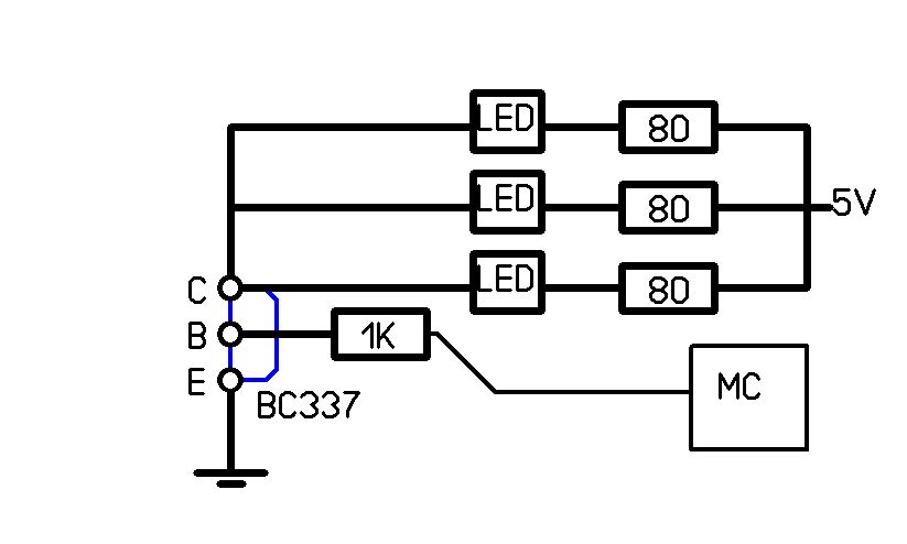 Du könntest mit dem 1k noch höher gehen. Der Strom durch C-E beträgt 3 * U / R = 3 * ( 5 - 1.2 ) / 80 = 142 mA (Ich hab mal 1.2 V pro LED angenommen) Um 142 mA durch die C-E Strecke zu jagen, muss an der Basis ein Strom von 142 / 100 = 1.42 mA fliessen. ( 100 ist die Stromverstärkung des Transistors aus dem Datenblatt. Die hab ich mal konservativ angenommen. Real wird sie höher sein). Um 1.42 mA durch die Basis zu jagen, braucht es einen Widerstand von ( 5 - 0.7 ) / 0.00142 = 3028 Ohm. Mit 2.2kOhm bist du also locker dabei.