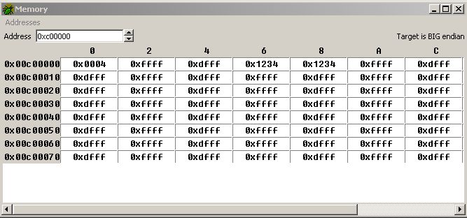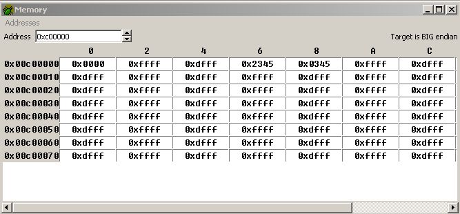 Bitte mach mal mit GDB zwei Memdumps des Bereichs 0xC00000 bis ca. 0xC0007F 1. nach dem Sektor Erase und 2. nach dem Schreiben des Wertes 0x1234 (*((short*)(0xC00000L + 2 * 0x0002)) = 0x1234;). So wie auf dem Bild debug2.gif oben.