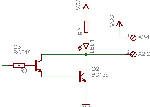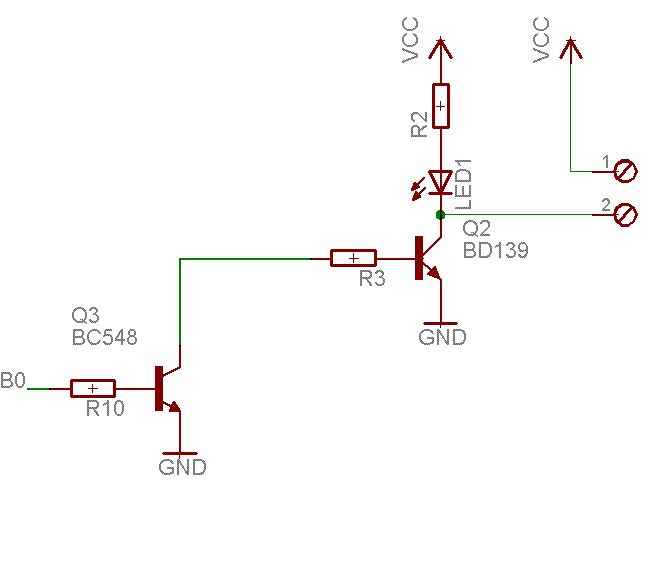 Hi, Klingt gut. Danke. Ich habe nun also einen zweiten Transisitor vorgeschaltet. Die Schaltung soll wie folgt funktionieren: Liegt an Port B Pin 0 ein "High-Pegel" an, so schaltet der Transistor Q3 BC548 durch. Die E - C - Strecke wird leitend. Dadruch fließt ein Strom. Dieser Strom wird vom Widerstand R3 bestimmt. Dieser ist gleich dem Vorwiderstand zum BD137. Dieser kann somit auch durchschalten. Die Led leuchtet. An der Klemme 1 und 2 werden 0,9 A geschaltet. Stimmt alles so?
