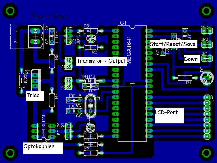 Hallo, Ich wollte einmal fragen, was ihr zu dieser Schaltung sagt, bzw. zu dem Layout. Es stellt einen Belichtungstimer da. Zur Funktion: Taste up: Hiermit lässt sich die Zeit einstellen. Also die Sekunden hochzählen. Taste down: Hiermit lässt sich die Zeit einstellen. Also die Sekunden herunterzählen. Save: Die eingestellte Zeit lässt sich im RAM ablegen. Start: Der Counter wird gestartet. Reset: Stopt den Counter. Nach ablauf der Zeit schlatet der Transistor durch. Es kommt ein BD 137 zum Einsatz. Der soll eine Last von etwa 5 Watt schalten. Der Triac Ausgang ist dazu gedacht, dass ich eventuell das Programm so erweitern kann, dass ich Wechselstrom schalten kann. Sind die Abstände dazu im Layout ok? Verbesserungsvorschläge gern.