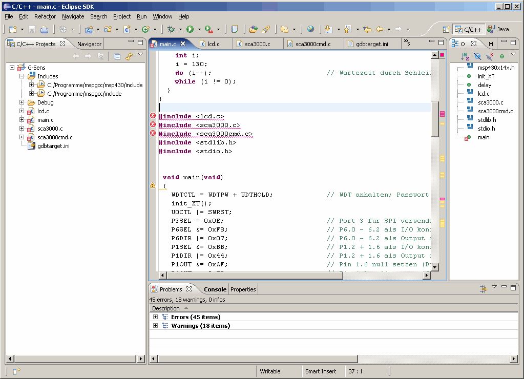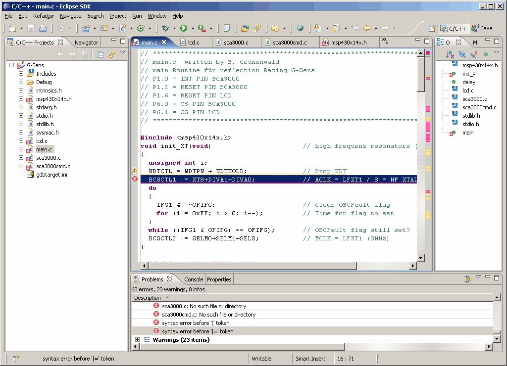 Salu zusammen Ich bin am verzweifeln :o) Bin seit Stunden hier am probieren die Entwicklungsumgebung MSP430 Eclipse mspgcc zum laufen zu bewegen. Ich habe es nun endlich geschafft ein managed C Project zu erzeugen, habe auch überall nach der Anleitung die hier auf der Homepage ist, msp430x149 eingestellt. Nun habe ich meine bereits existenten Files aus IAR übernommen (neue Files in Eclipse erzeugt und Quellcode kopiert) Includes habe ich mspgcc und noch die von IAR angegeben, aber wenn ich speichere, sprich auch gleich Compiliere, spuckt er mir 60 Errors und jede Menge Warnings raus. Die meisten lauten so in etwa: P1SEL undeclared (first use in this function) Habe auch noch ein Pic angehängt, vielleicht sieht man da was. Ich glaube aber ich habe das deklariert in den .h Files. Kann es sein das ich die noch speziell anhängen muss? Wäre über jede Hilfe dankbar Gruss reflection