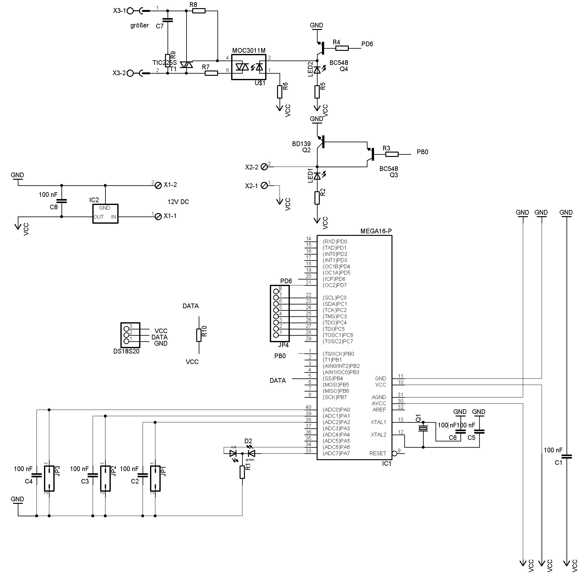 Der Schaltplan ist einfach nur um 180° verdreht. Dreht man Ihn, so liegt VCC oben und GND unten ;). Und die Schaltung mit dem Optokoppler ist korrekt. Der Triac wird durchgeschaltet. Das doch richtig. Die 100 nF sind ein Tipfehler. Sind 22 pF. Das Display hängt an Port C. Folgende Belegung: PC0 - PC3: DATA 0 - DATA 3 (4-Bit-Mode) PC4 : E(nable) PC5 : RS PC6 : VCC (also "High") PD7 : GND R/W ist fest auf einen Pegel gesetzt, da nur geschrieben werden soll. Das mit dem Display sollte klappen. Der Port-Pin PC6 sollte genügend "Strom zur Verfügung stellen". ;) Okay mit dem Spannungregler, dass sehe ich ein , dass ist "Bockmisst". Ich dachte jedoch immer, dass die Kondensatoren nur zur Glättung des Eingangs bzw. AUsgangssingnales da wären. Fehler kann jeder machen. Also liegt der Hauptfehler wohl echt bei der Spannungsversorgung. Werde den Regler einmal auslöten und dass ganze mit 5 V Gleichspannung von Netzteil bezogen versorgen. Was habt ihr denn an der Schaltung rund um den Optokoppler auszusetzen? Schalte damit 230 V AC. Auf Abstände und dimensinierung ist geachtet. Gruß Timo