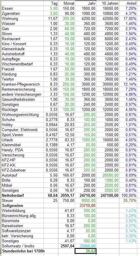 Du kannst ja einfach Deine Zahlen einsetzen. Jeder gibt seine Kohle für was anderes aus. >Du kaufst im Jahr für 200 Euro Schuhe? Den Posten halte ich für normal: Ich persönlich kaufe alle 2-3 Jahre ein neues paar guter Schuhe, dazu kommen Sommersandalette, die ich nur ein Jahr trage. Das sind schon alleine 70- bis 80,- im Jahr denn was soll ich mit billigen Dingern vom Deichmann? Ausserdem brauche ich auch noch Laufschuhe! Dafür gebe ich weniger für Mode aus. Meine Freundin kauft sich fast jeden Monat was Neues :-( >150 Euro im Jahr für eine Brille? Eine guten Brille kostet schon seine 400,- Euro und wenn man alle 3 Jahre eine Neue nimmt ... ? >Handy, PDA: 200 Euro pro Jahr? Was soll das sein? Der private Hanyvertrag und der Anschaffungspreis eines PDA verteilt auf 3 Jahre inklusive Software und privater Telefonkosten. > 650 Euro im Jahr für die Einrichtung der Wohnung? So war es die letzten Jahre, ja. Inklusive Fernseher, Audio und Videorekorder und Möbel dafür - anteilig umgelegt. Aber wie gesagt, Du darfst gere mehr einsetzen. >300 Euro im Jahr für Computer/Elektronik Privater Rechner und Zubehör + Kosten umgelegt auf die Nutzungsdauer. Alles oben sind private Kosten. Alles unterhalb der Nettosumme sind betriebliche Kosten, die vor der Steuer abgehen. Darin enthalten sind auch die betrieblichen Telefon und Computerkosten. Das alles sind die realen Zahlen, aber die sind wie gesagt von Person zu Person unterschiedlich. Wer nicht viel geschäftlich fährt, hat z.B. auch nicht die immensen Reisekosten. Das ist bei mir dereit so ziemlich der fetteste Brocken.