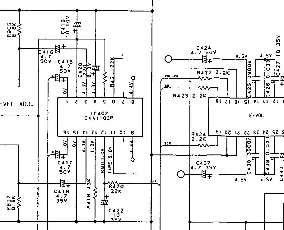 Nachtrag: Ich weiß jetzt nicht welche Funktion der CXA1102 genau hat, aber eventuell wäre es besser das Audiosignal am Pin 3 und 14 des CXA1102 einzuspeisen. Es kann sein das der CXA1102 zwischen Radio und Kasette umschaltet. Wenn Du das Signal nach dem CXA1102 einspeist würde in dem Fall der Verkehrsfunk nicht mehr funktionieren. Also besser das Signal vor C416 und C418 einspeisen.