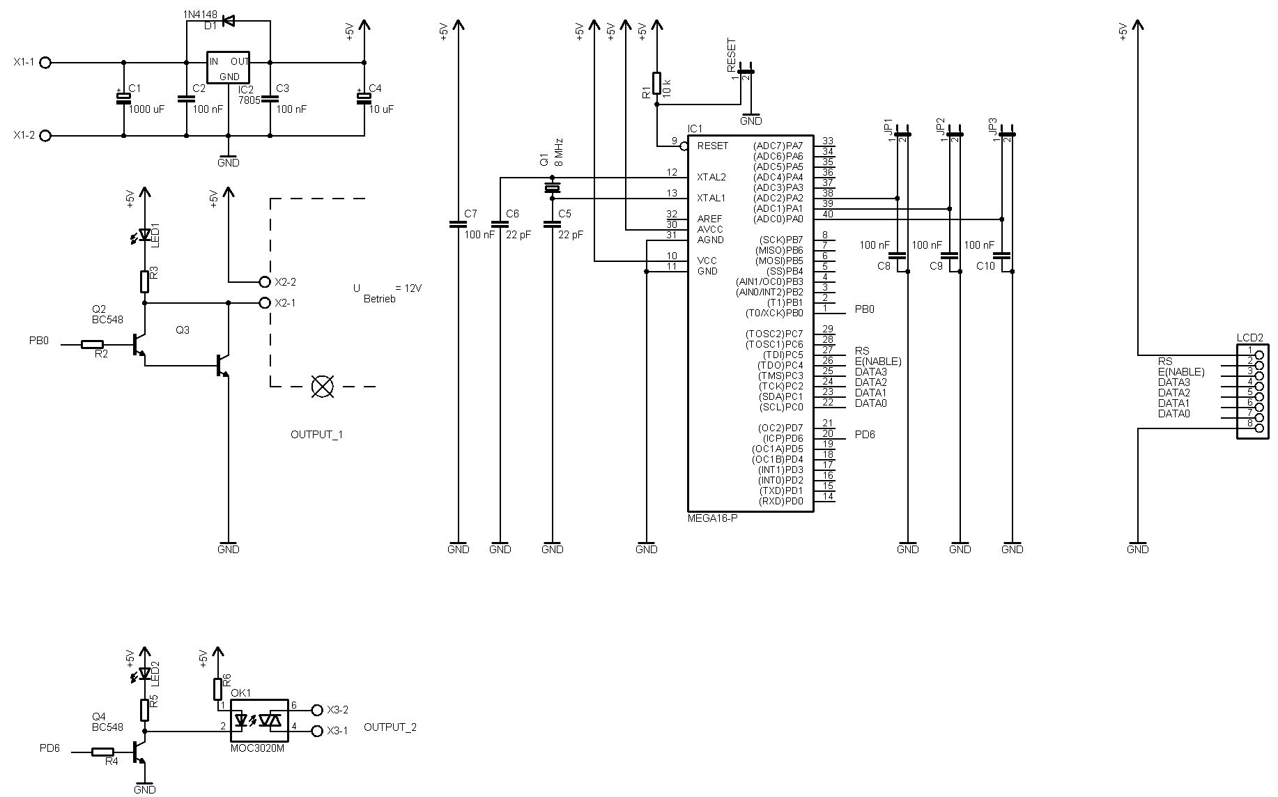 Aref braucht ein C (100 nF) nach Masse. Vergisst nicht die JTAG zu ausschalten oder die LCD wird nicht funktionieren. Im Schaltung steht nicht die ISP Connector, vergisst es auch nicht :-) Für 18 V am X1, vergisst nicht ein Kühlkörper für das 7805. Die D'arlington Ding... geht nicht. ----- 12 V | 0 Lampe/ Led | 4k7 | | 1 kohm (nur für LED) __ | ---____---K NPN | --- GND So wird klappen. du kannst ein LED (mit Widerstand) und eine Lampe Parallel ansteuren mit ein Transistor. An der Leistung beachten.