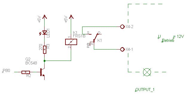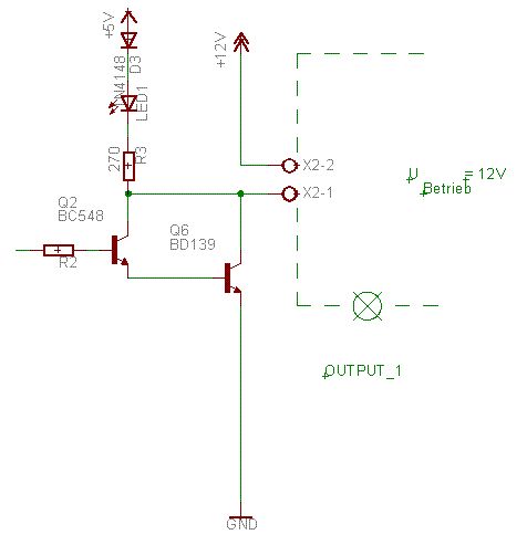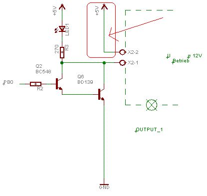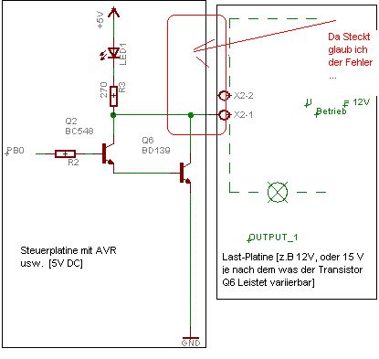 Guten Morgen ... Also entweder wir reden an einander vorbei, oder ich habe das Problem nicht deutlich gemacht. Tippe auf Letzteres. Also nocheinmal ganz langsam: Im Anhang befindet sich ein Schaltungsausschnitt. Ich habe eine Mikrocontrollerschaltung gebaut. Diese besteht auf AVR und Umgebung. An den Ausgänge des AVRs sitzen wie in dem Schaltplan angedeutet Transistoren, wie eine Last schalten sollen. In dem Fall liegt Q2 mit seinem Vorwiderstand an Pin PB0. Schaltet Pin PB0 auf "High", so "leuchtet" die LED. Der Widerstand R3 begrenzt den Strom der LED. Also einfach den "Transistor Q2 als Schalter eingesetzt". Nun habe ich jedoch eine Last, die einen Leistungstransistor benötigt. Da der Controller pro Pin jedoch nu max. 20 mA liefert und der Leistungstransistor in der Basis ein wenig mehr benötigt schalte ich den Leistungstransistor Q3 wie im Schaltplan gezeigt. Q2 und Q3 bilden als eine Darlington-Schaltung. Nun Schaltet Q3 ebenfalls durch, wenn an Pin PB0 "High" liegt. Der gewünschte Effekt. Soweit zu meiner mit 5V betriebenen Steuerplatine. Mit dem Transistor Q3 möchte ich jetzt eine 12V Last schalten. Diese Last befindet sich auf eine völlig anderen Platine. Diese Platine bezieht ihre Betriebsspannung von 12 V DC von einem ganz anderen Netzteil. Also vollkommen unabhängig von der Steuerplatine. Soweit zu meiner mit 12V betriebenen Last - Platine. Ich möchte nun auf meiner Steuerplatine irgendwie zwei Anschlussklemmen X2 anbringen. Diese sollen mir den Anschluss der Last-Platine ermöglichen. An X2-1 wird zum Beispiel ein Verbraucher, der an GND (Seperat und NICHT von der Steuerplatine, sondern von der Last_Platine) angeschloßen ist angeschloßen. An X2-2 wird dann 12 V angelegt( Die ebenfalls NICHT von der Steuerplatine zu beziehen sind).