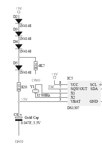 Im Netz habe ich eine Schaltung gefunden, um eine DS1307-Uhr mit einem Goldcap-Kondensator statt Batterie zu buffern. Dazu habe ich zwei Fragen an Elektronik-Kundige: 1. Welchen Sinn hat der R16? Könnte man R16 und D5 weglassen (die Uhr braucht 2 bis 3.5V, an jeder 1N4148 fällt ~ 0.7V ab, dann müsste doch der C8 auf 2.9V aufgeladen werden)? 1. Weiss jemand, wie lange ein 220.000µF-Konsensator in dieser Situation ungefähr durchhält? Die Uhr braucht 200 uA Standby-Strom.