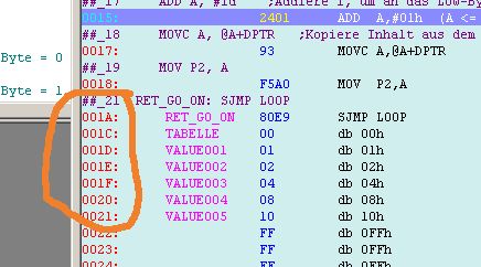 Am Port P2 sind 8 LEDs angeschlossen. Mit diesem Programm sollte bei einem Tastendruck (Taster am P3.3) immer eine LED weitergeschaltet werden. Stattdessen leuchtet am Anfang die zweite, dann die vierte und bei einem weiteren Tastendruck die erste LED. Danach erscheinen alle möglichen Kombinationen, da der Datenzeiger scheinbar irgendwo auf den Code zeigt, weil das Array zu ende ist. Ich werde jetzt noch weiter mit dem Debugger rumspielen, aber vielleicht sieht jemand den Fehler auf Anhieb? update: Irgendwie werden die dezimalen Werte nur in einem Byte gespeichert. Der Assembler beachtet den High-Byte gar nicht. Das erklärt das Verhalten des uC. Ich benutze die kostenlose Version von RIDE 6.10.15. Liegt es an dem Programm oder muss ich die Schreibweise irgendwie verändern, dass er z.B. die Zahl 513 automatisch in zwei Bytes ablegt?