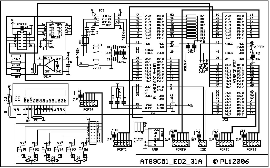 Hallo, da mir wiederholt eine Basis-Hardware für ähnliche 8051-Projekte fehlt, will ich mir nun eine Art Grundkonfiguration selber schaffen. Die STK08 bzw. STK11 sind aus meiner Sicht nicht einsetzbar. Meist brauchte ich bisher eine LCD-Anzeige, paar Tasten und einige LEDs und noch den spezifischen Teil, je nach Projekt. Da nicht immer alle Komponenten gebraucht werden, sind zusäzlich alle Ports auf 2 Steckverbinder gelegt. Das Board soll die per SPI und die per UART programmierbaren Typen (AT89Sx und AT89Cx) im PLCC44 Gehäuse unterstützen, als Software kommt FLIP bzw. eine der vielen ISP89S-Software in Frage. Frage an die Spezis hier, ob an meiner Schaltung noch Verbesserungsbedarf besteht, oder was sinnvolles zu ergänzen wäre? Bin über Tipps dankbar. (Anlage PDF ca. 150kb) Leider hat Atmel die Belegung der SPI-Pins zwischen 89S... und 89C... geändert, was ggf. zu etwas Verwirrung sorgen kann. Der Grund erschliesst sich mir bisher nicht. Grüße Matthias